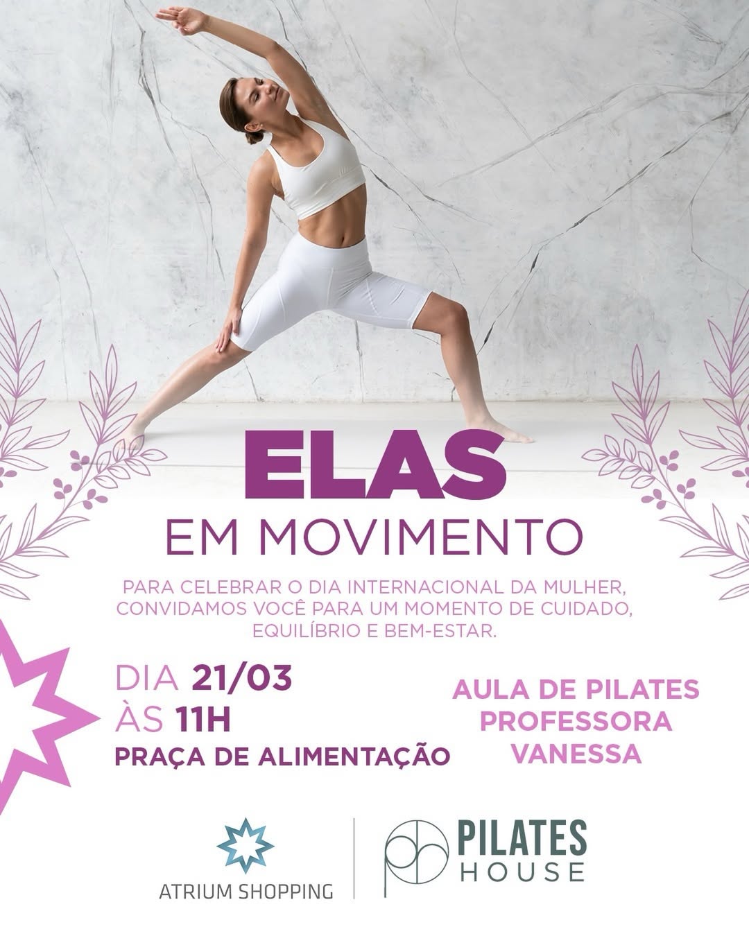 No sábado (21), a agenda começa com o “Elas em Movimento”, iniciativa que integra as ações do Mês da Mulher e convida o público a desacelerar e cuidar do corpo e da mente. A atividade será uma aula especial de pilates, conduzida em parceria com a Pilates House, às 11h. A proposta é oferecer um momento de equilíbrio e qualidade de vida em um ambiente acolhedor.