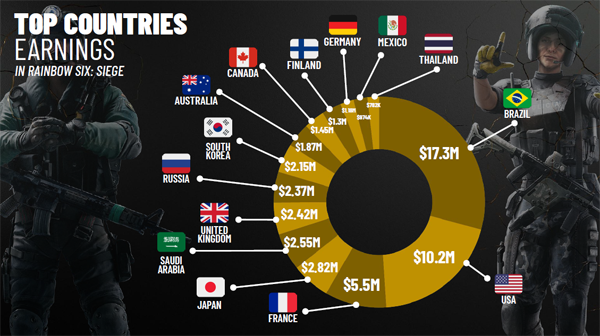 A relevância de R6S também se reflete no desempenho das organizações brasileiras. Entre as cinco equipes nacionais com maiores premiações acumuladas nos esports, quatro competem em Rainbow Six: Siege: FaZe Clan (1º — US$ 4,2 milhões), W7M Esports (2º — US$ 3,3 milhões), Ninjas in Pyjamas (4º — US$ 2,6 milhões) e Team Liquid (5º — US$ 2,3 milhões). Apenas a FURIA, com equipes de Counter-Strike, aparece fora da modalidade, ocupando a terceira posição.