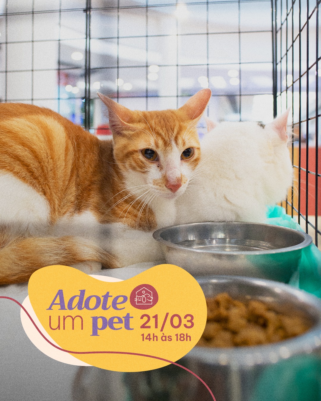 Em parceria com a ONG Entre Pegadas, o evento acontece no 2º piso, próximo à Renner, reunindo cães e gatos resgatados, todos à espera de um lar cheio de amor e cuidado.