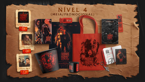 Já quem optar pelo nível mais alto terá acesso a benefícios como um livro oficial com roteiro comentado e fotos de bastidores; um kit com itens baseados no filme; a oportunidade de assistir à obra antes da estreia oficial em sessões exclusivas na Cinemark, em uma das sete capitais por onde a equipe vai passar ao longo de outubro: Recife (06/10), Salvador (07/10), Brasília (08/10), Belo Horizonte (09/10), Rio de Janeiro (14 e 15/10), Porto Alegre (16/10) e São Paulo (21 e 22/10).  Quem participar da exibição, receberá um Combo de pipoca com balde exclusivo, junto com refil e bebida.