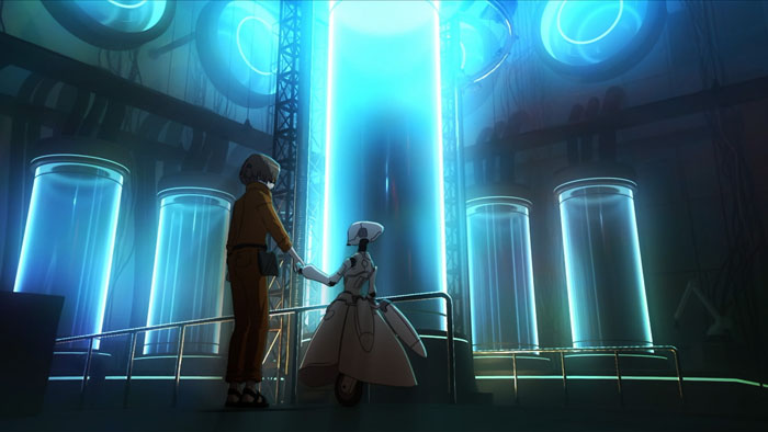 Sobre o visual em si, temos um anime em computação gráfica que  imita animação 2d convencional, deixando tudo suave e fluido. Ao mesmo tempo, o clima inicial de suavidade e delicadeza com pontuais momentos sombrios no laboratório disfarçam a tragédia romântica cyberpunk que é o núcleo do anime.