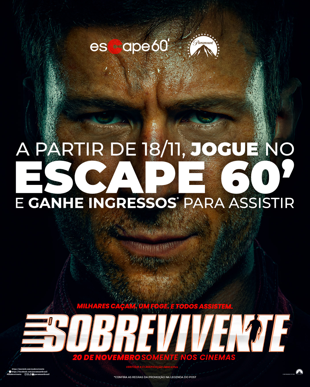 A partir de hoje, 18 de novembro, jogando qualquer sala do Escape 60’, você ganha ingressos para assistir nos cinemas a “O Sobrevivente”, o novo longa da Paramount Pictures, baseada na obra homônima de Stephen King.