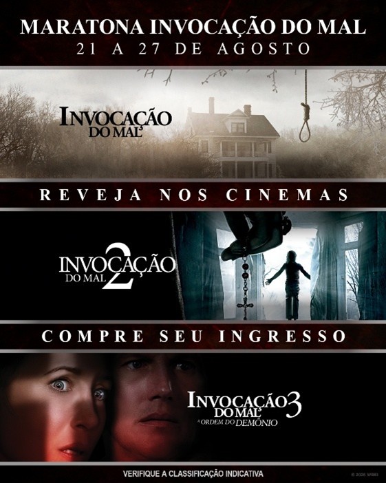 Fãs de terror já podem se preparar para reviver as histórias que assombraram gerações. A Warner Bros. Pictures Brasil acaba de anunciar o retorno dos três primeiros filmes de “Invocação do Mal” às telonas, em uma maratona especial entre os dias 21 e 27 de agosto.