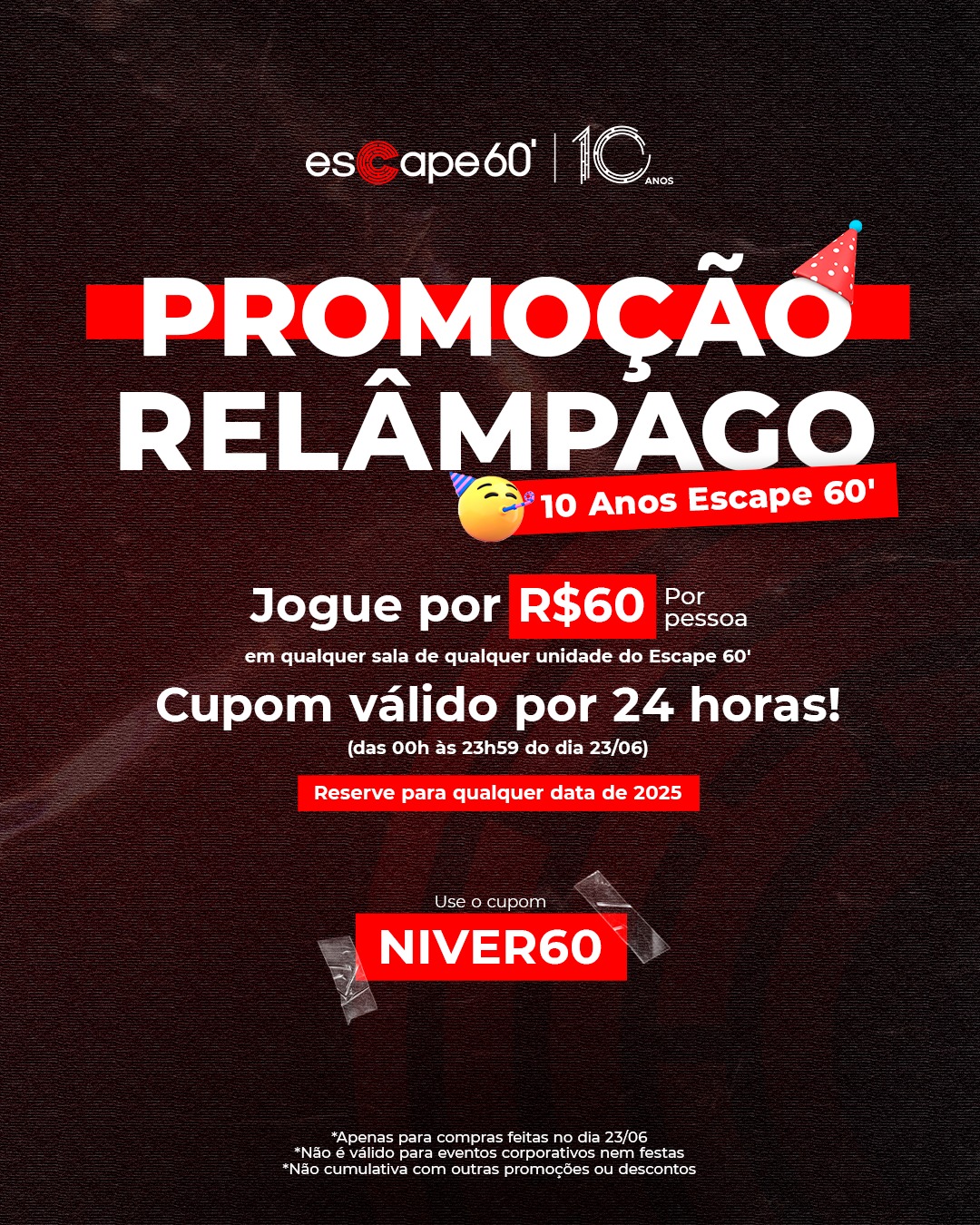 Nesta segunda-feira, 23 de junho, um cupom especial (NIVER60) será ativado e quem usá-lo em sua reserva, pagará um preço diferenciado: R$ 60,00 por pessoa, em qualquer unidade da casa de jogos de fuga.