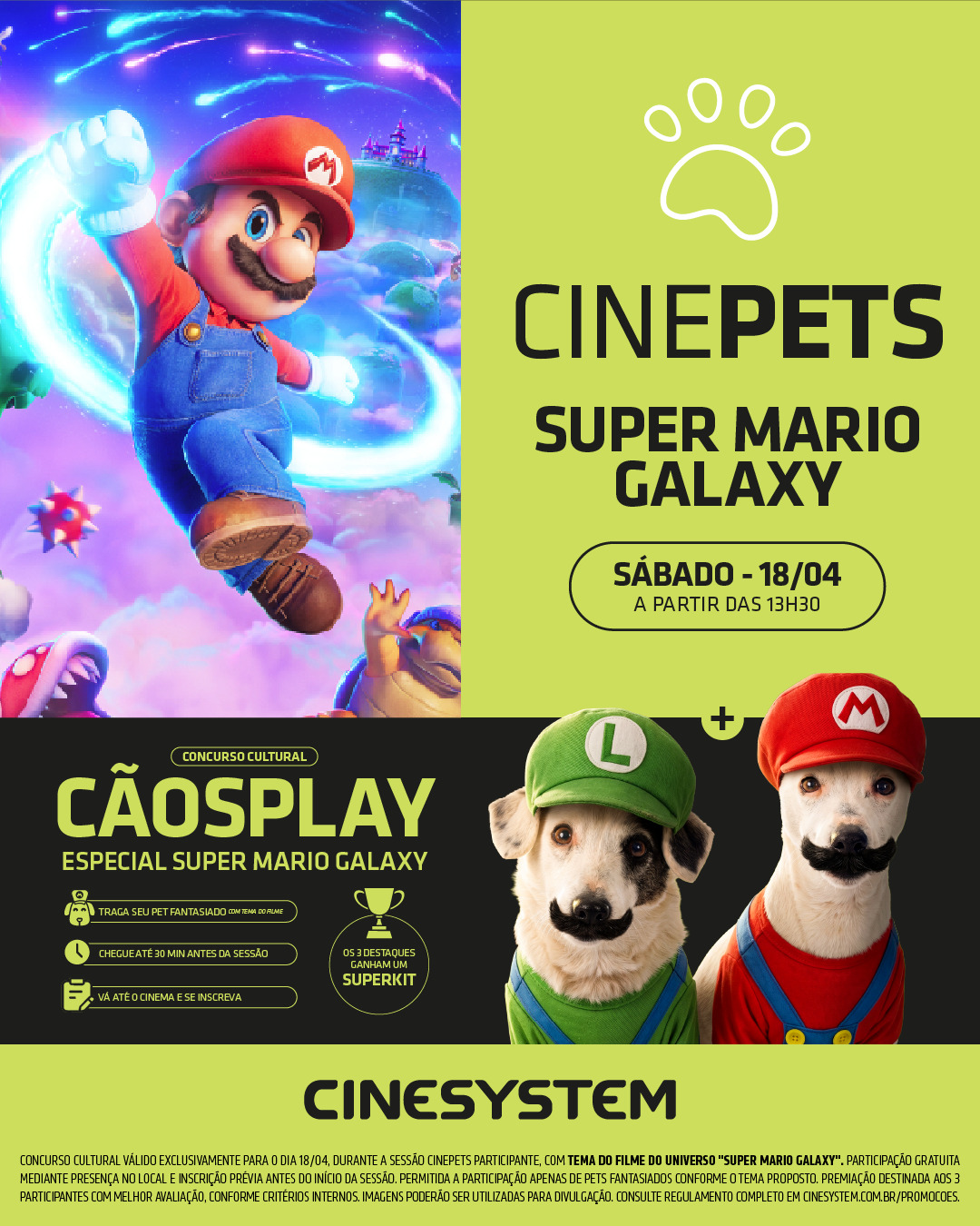 A ação acontece em parceria com a Cinesystem, responsável pelas salas de cinema do empreendimento, e ganha um toque ainda mais divertido com o Concurso Cultural de Cãosplay, que traz como tema o universo de “Super Mario Galaxy”.