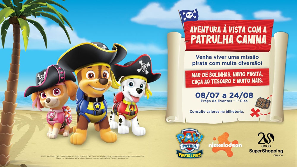 “Pirate Pups é mais do que um evento: é uma experiência imersiva, inédita e cheia de interatividade, que transporta as crianças para um universo de fantasia e aprendizado. É a oportunidade perfeita para as famílias criarem memórias especiais em um ambiente seguro e encantador”, destaca Karina Aono, coordenadora de Marketing do SuperShopping Osasco.